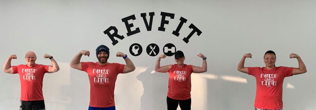 (Below is a recent shot of some of our socially distanced rockstars representing the newest line of our Rev swag in tribute to our Emily B. with a favorite saying of hers, “Pump Is Life”. Below is Bill, Shon, Amy and Cherie)