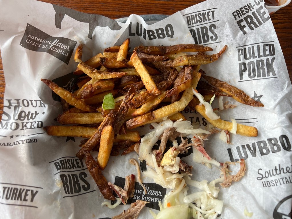 Shown below, about once a week, I go to a restaurant for a rather large pulled pork sandwich. I’m not crazy about most of their sides but I do like their french fries. I’m not sure about you, but fries, as delicious as they are, are extremely easy for me to over-consume. So, I practice walking away with this meal. I eat my sandwich, I pick at some of the fries, enjoy them, acknowledge that I could easily demolish the entirety of them, and then I push my plate away, get up and leave the establishment feeling neither deprived nor wasteful.